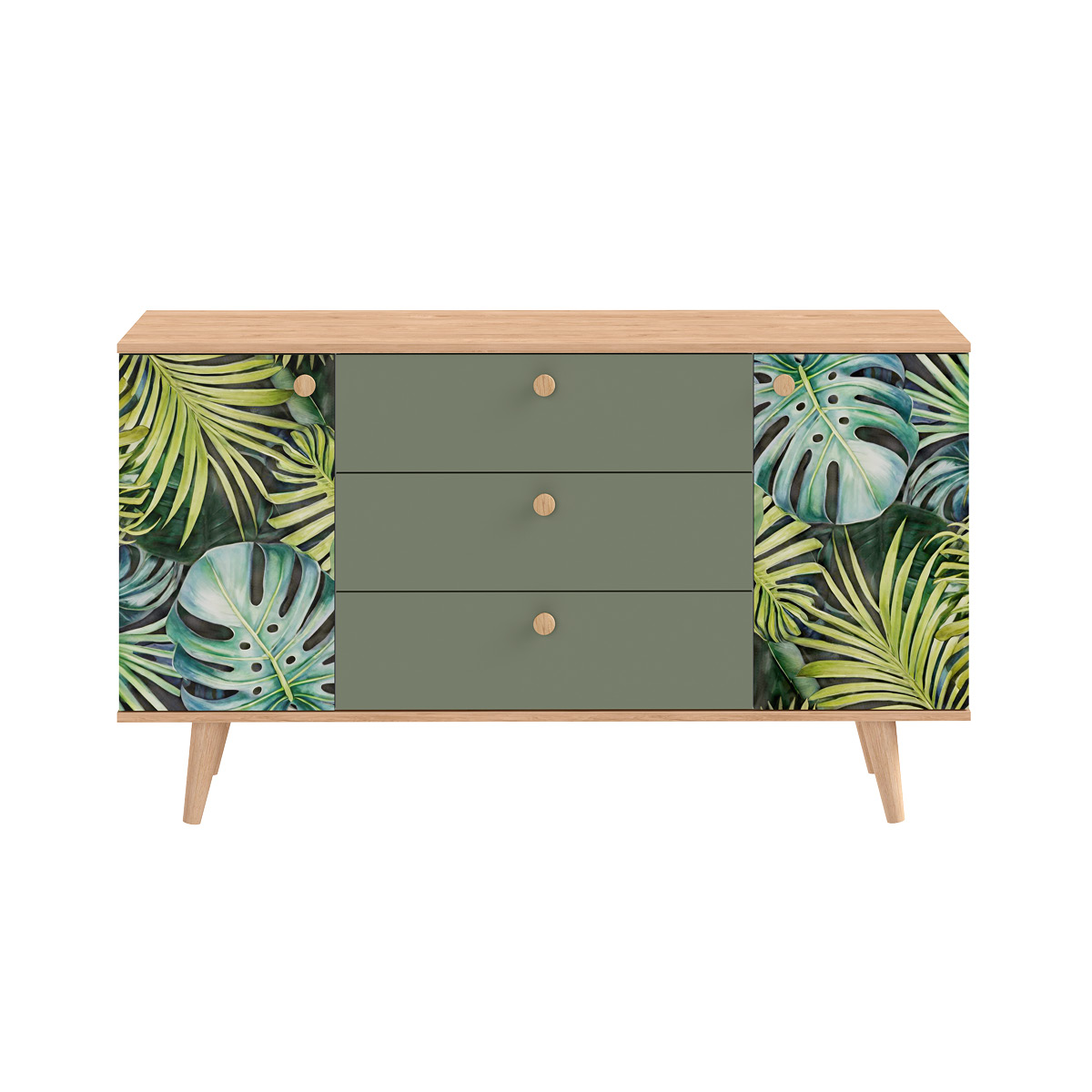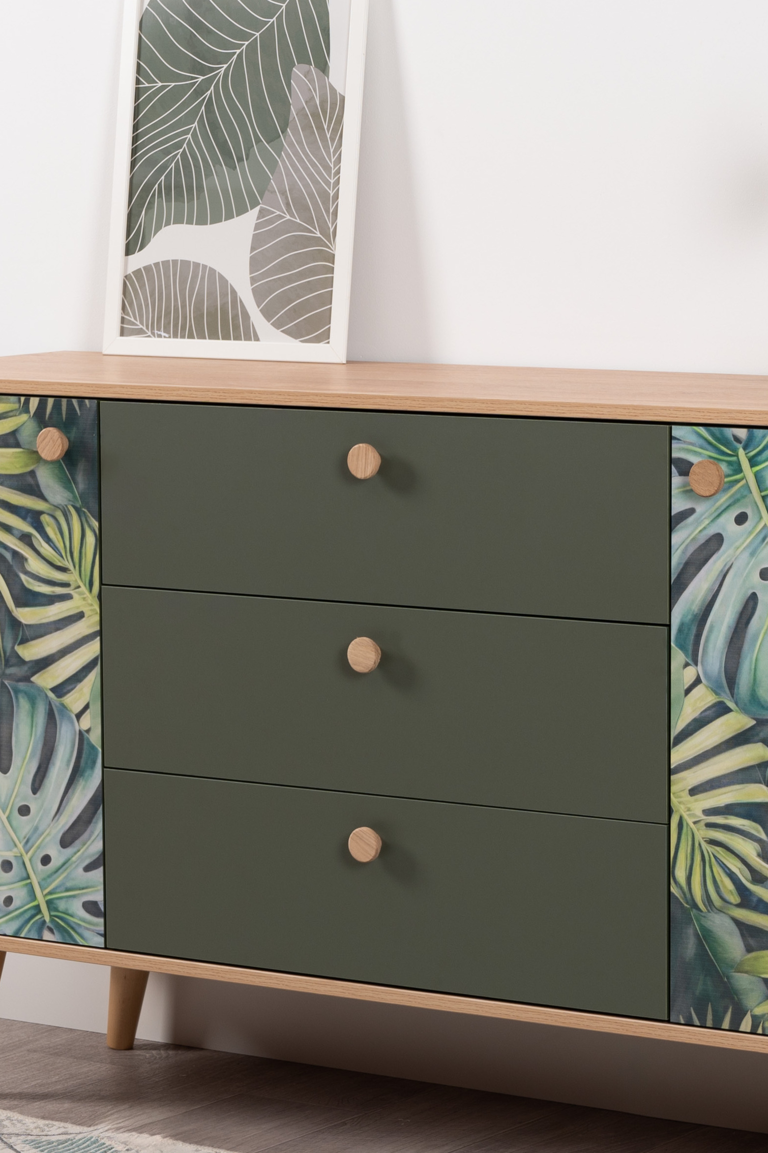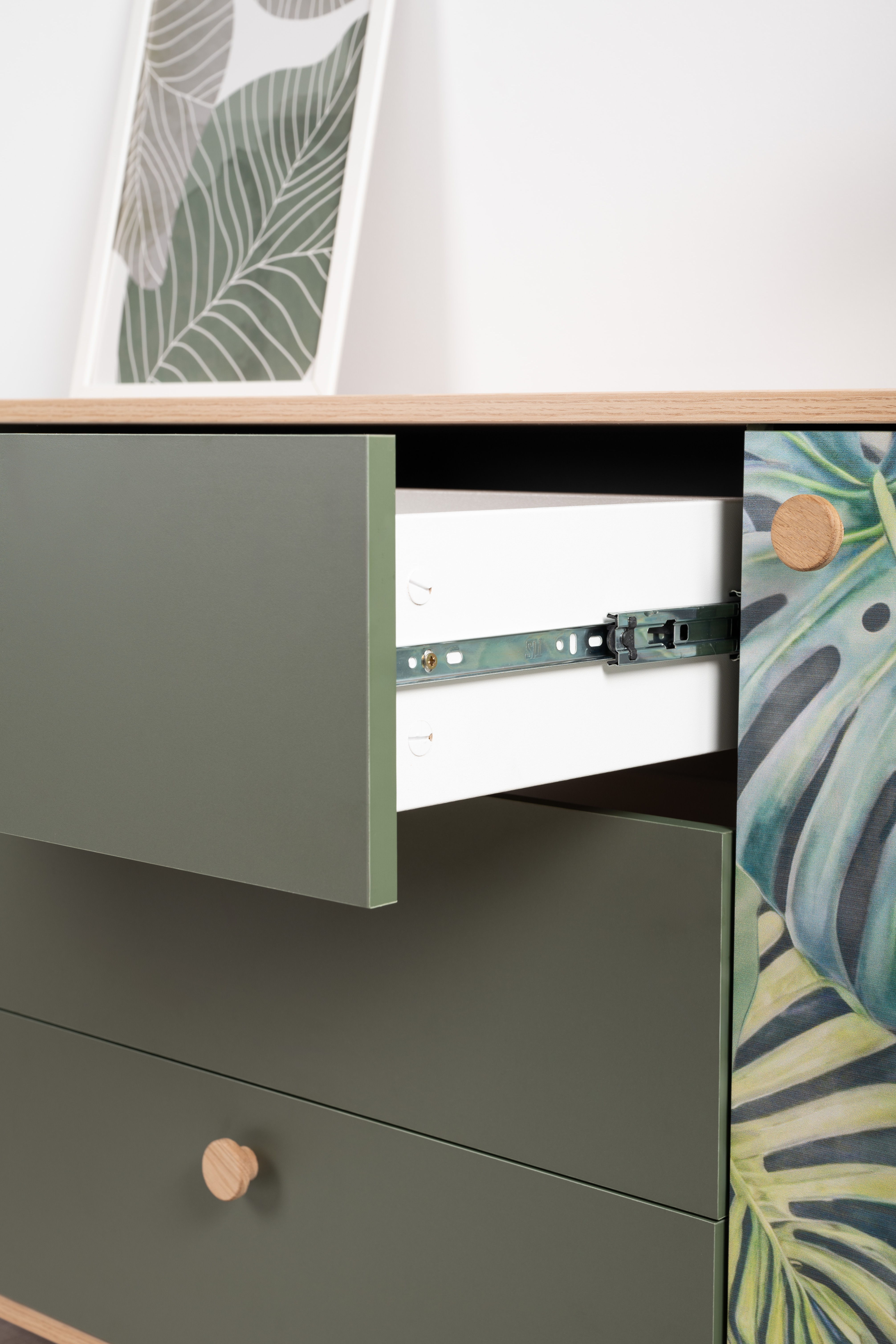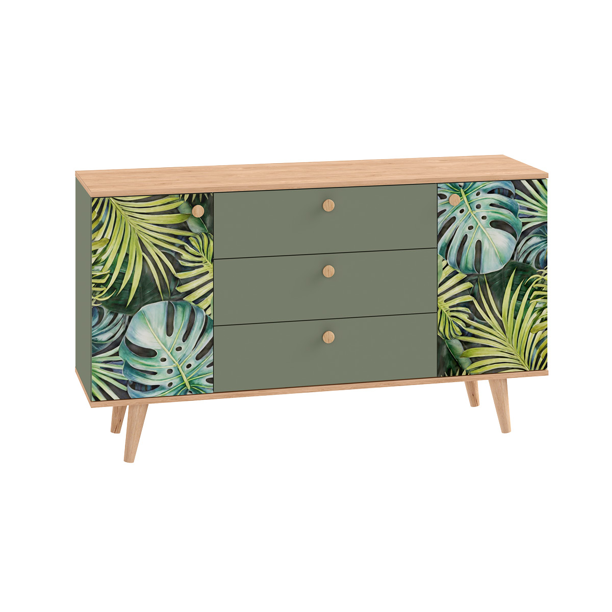 Комод Маттиас 16.245 дымчатый зеленый K521, гикори рокфорд натуральный KO86 PW, белый PE шагрень, фотопечать