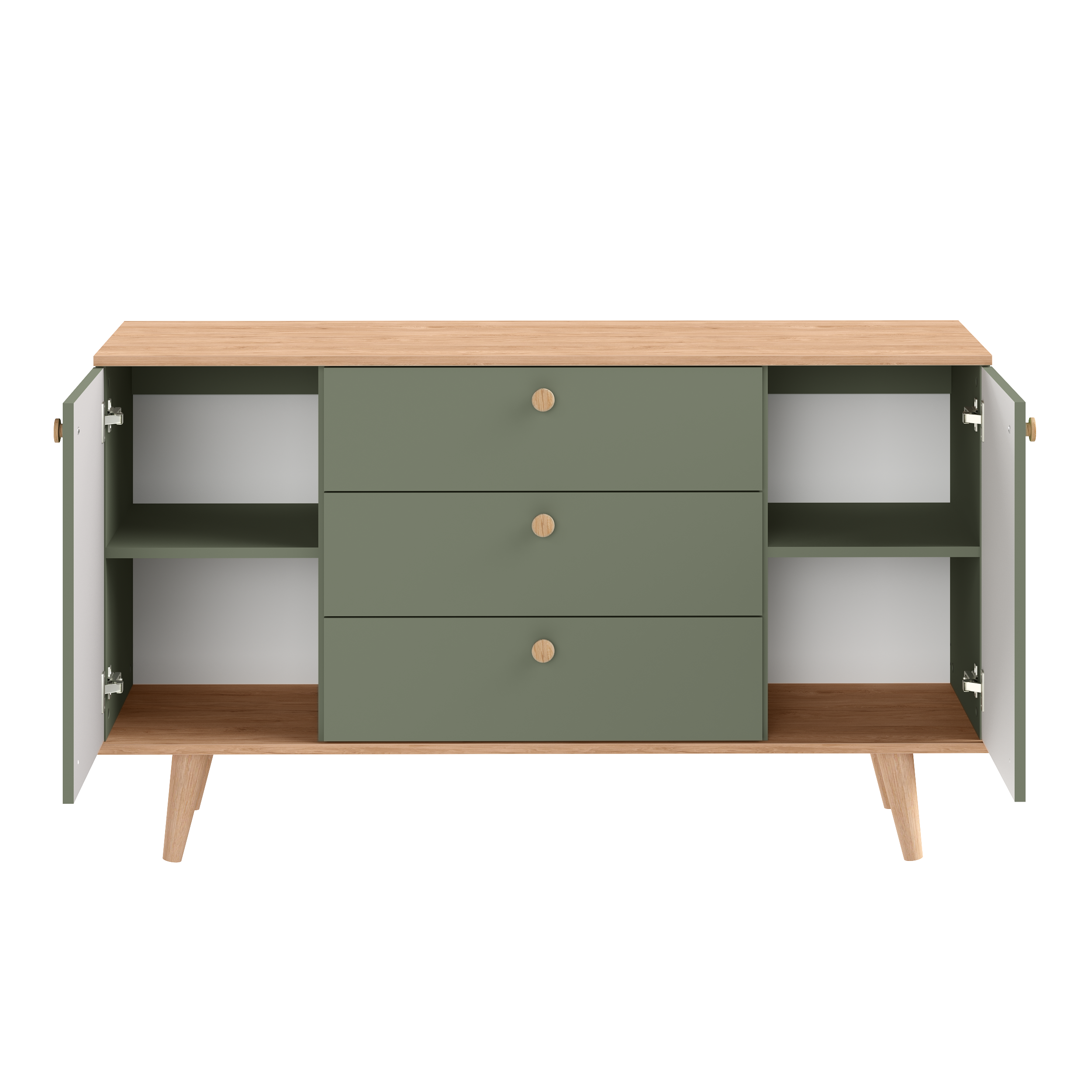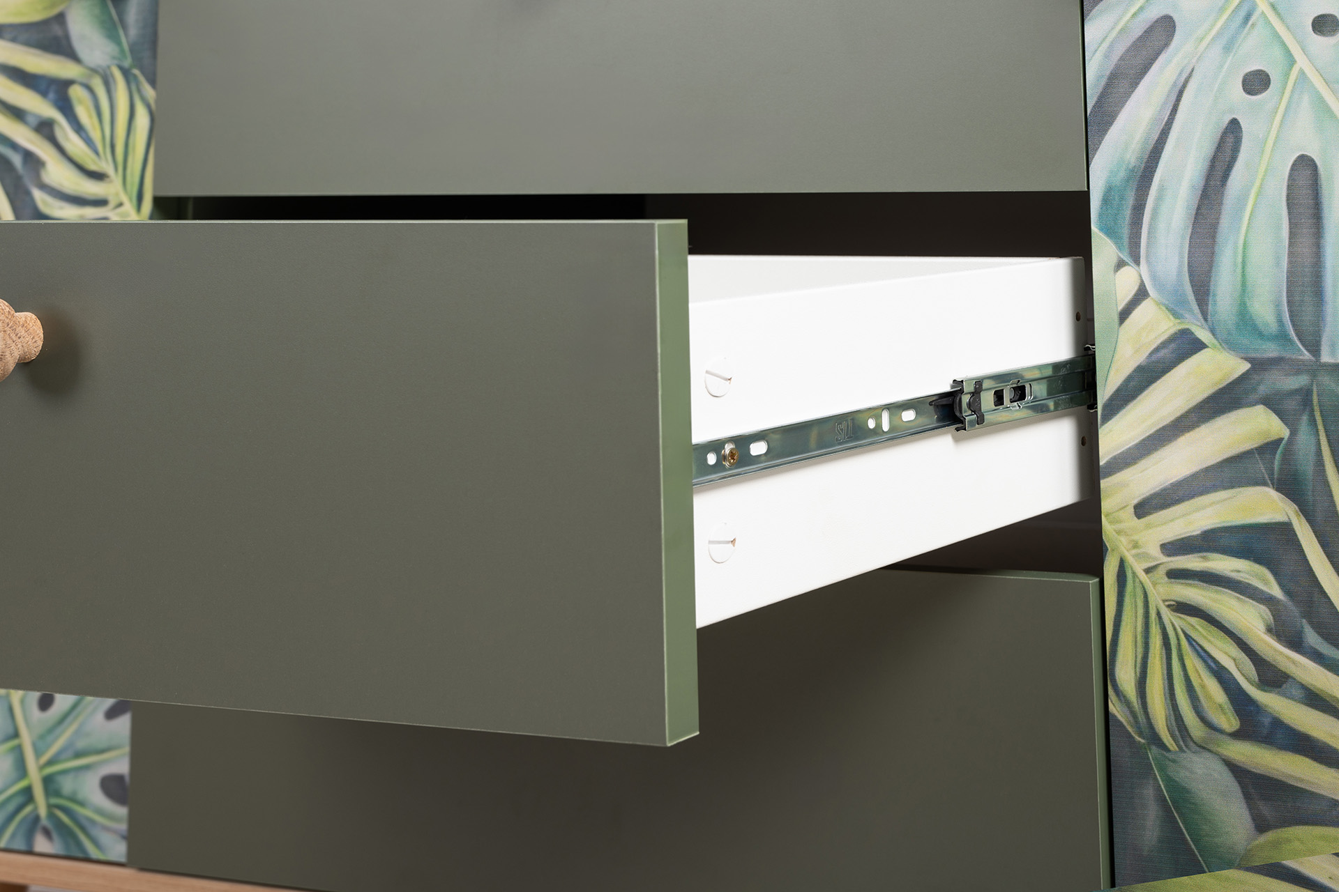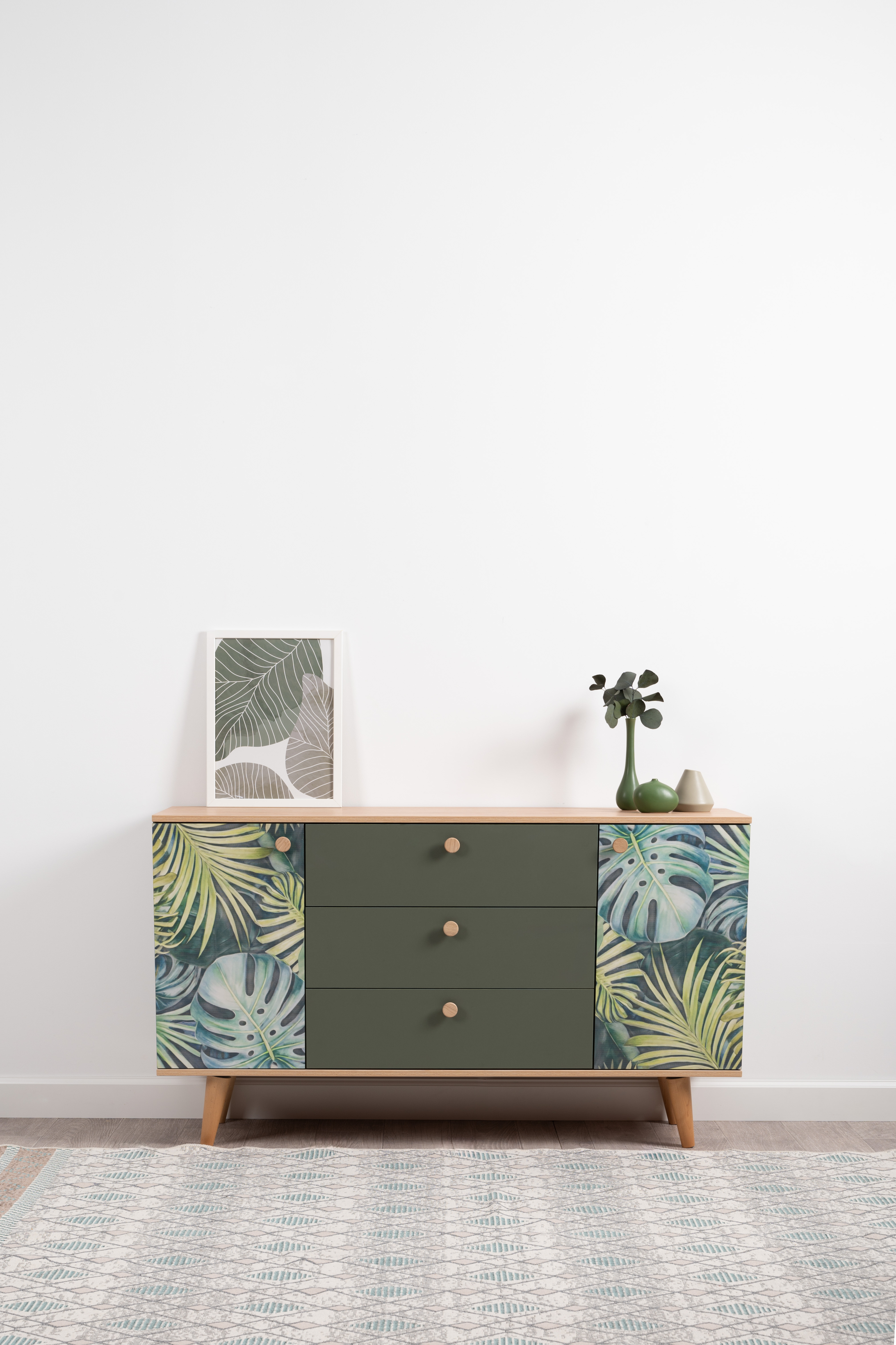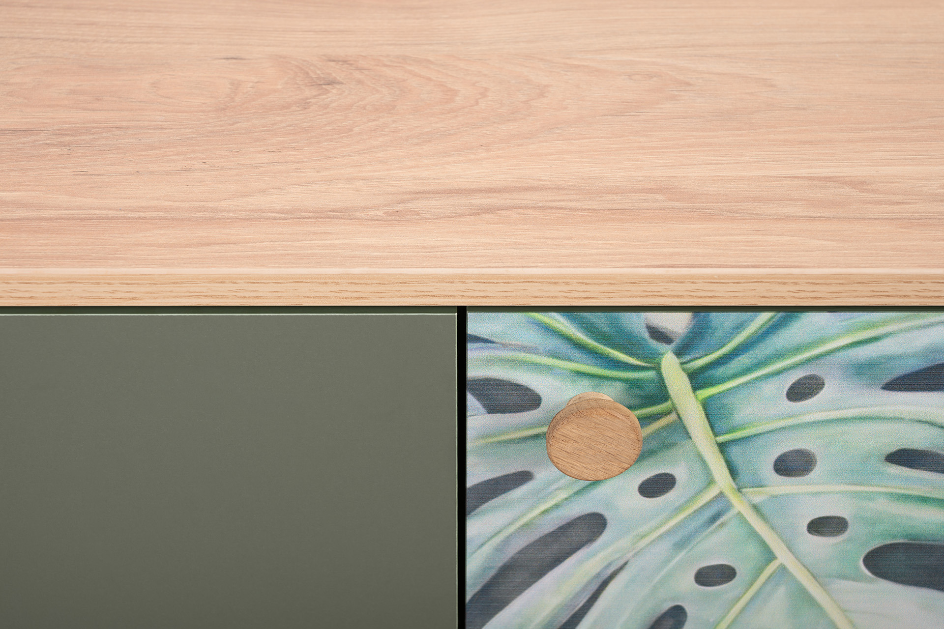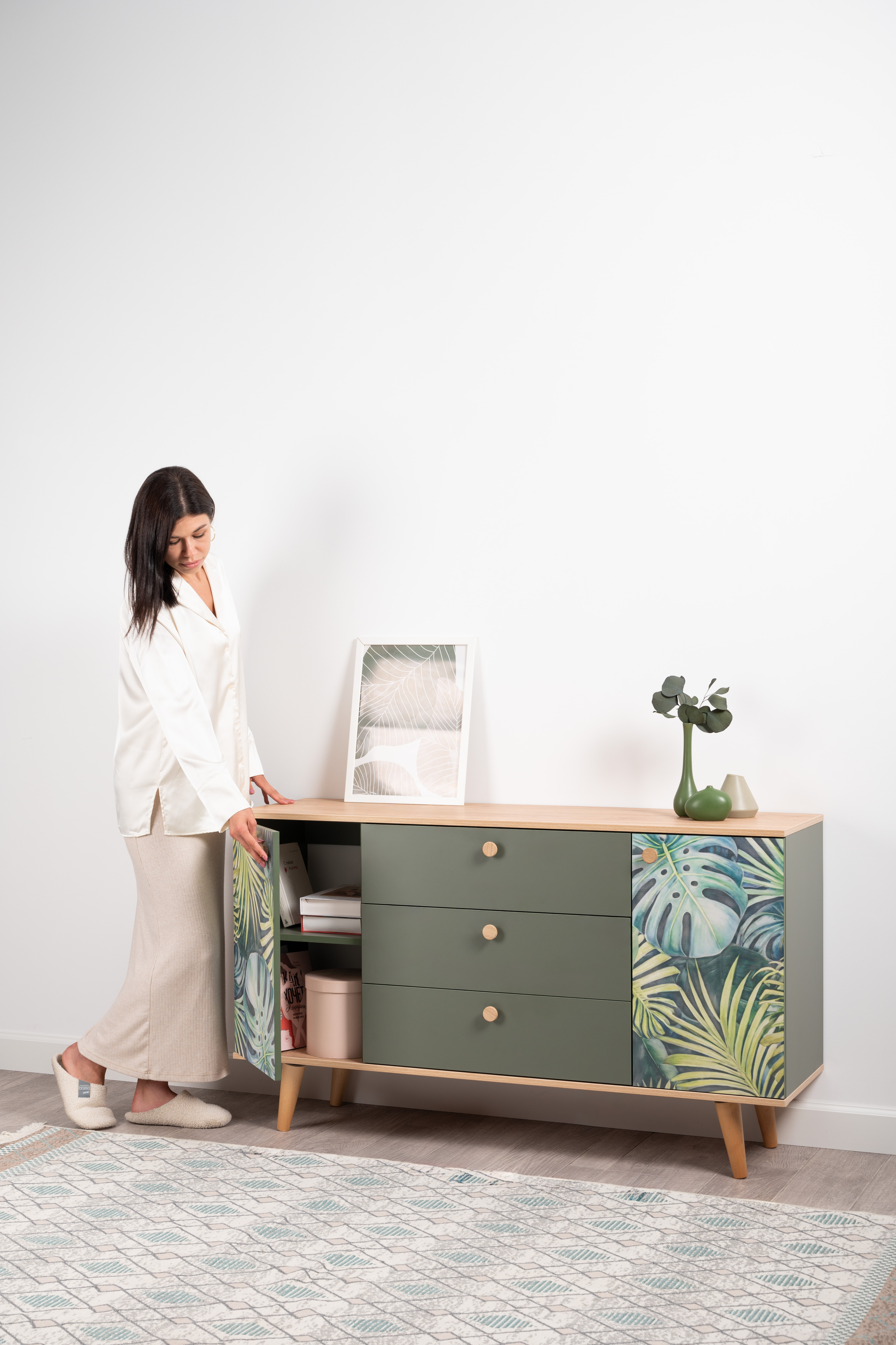 Комод Маттиас 16.245 дымчатый зеленый K521, гикори рокфорд натуральный KO86 PW, белый PE шагрень, фотопечать