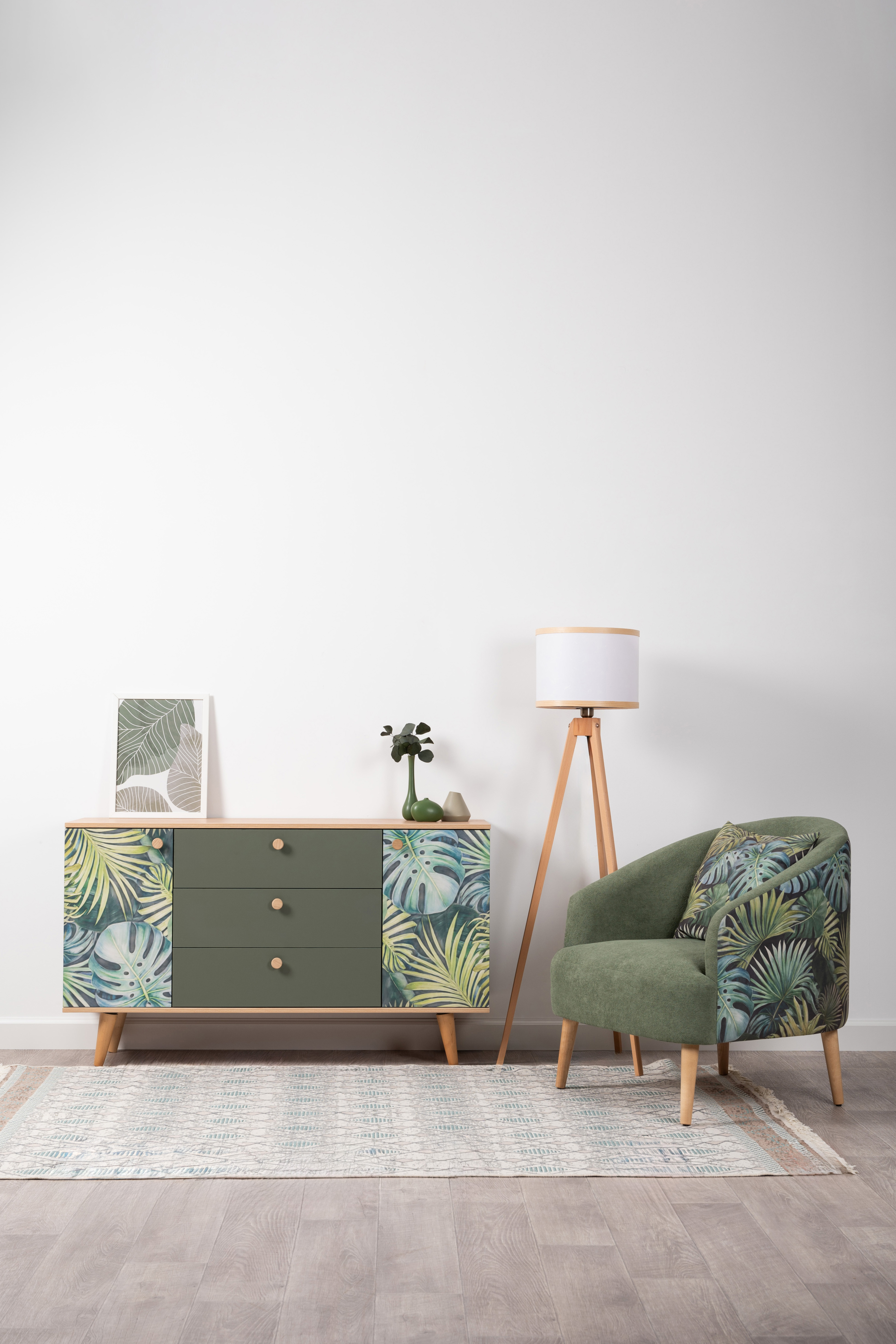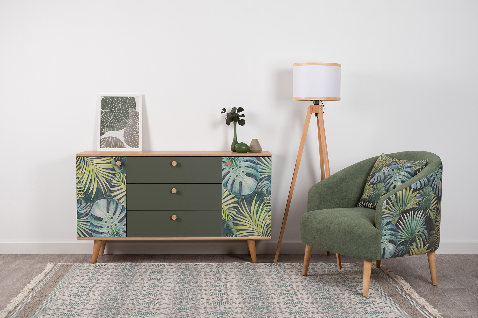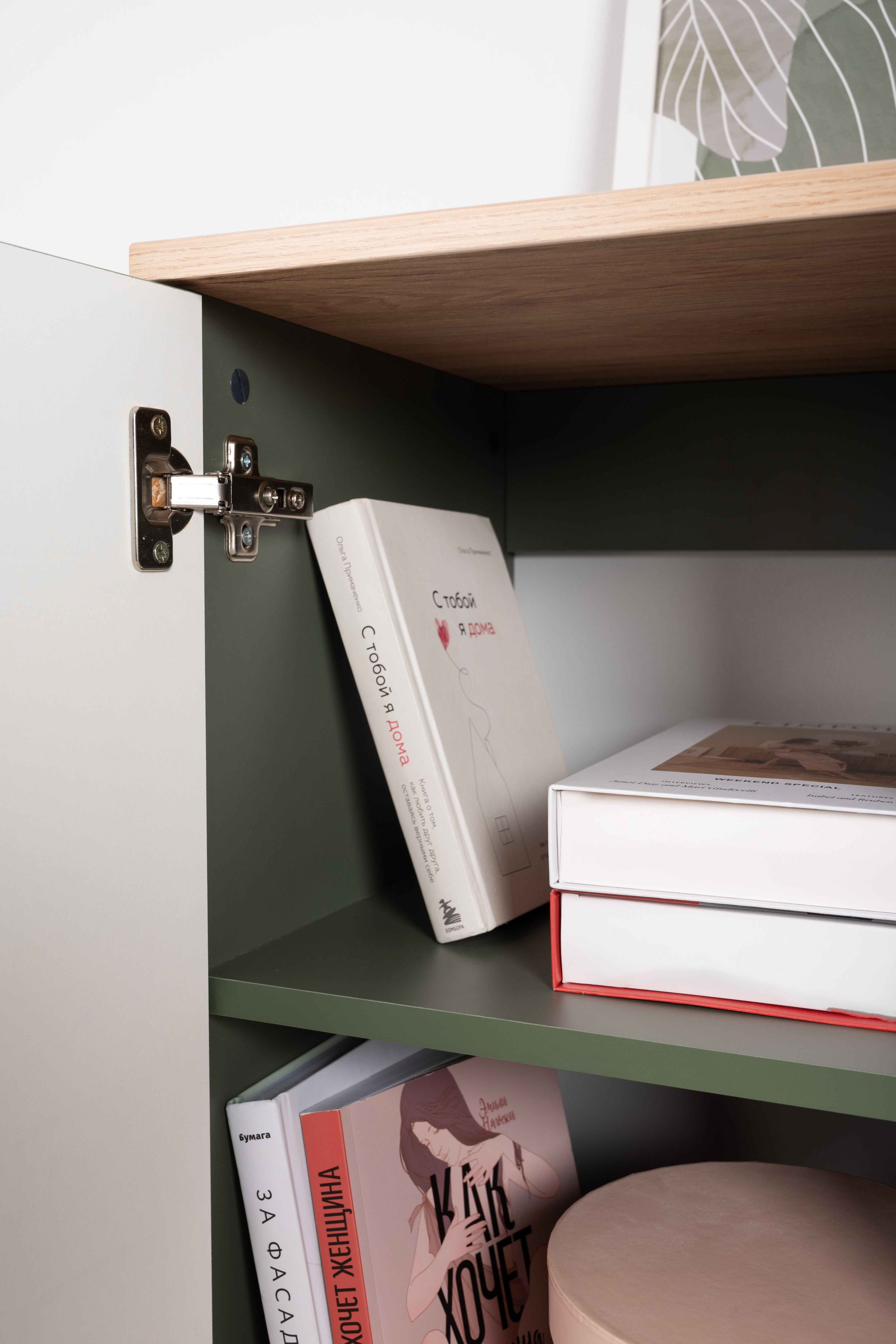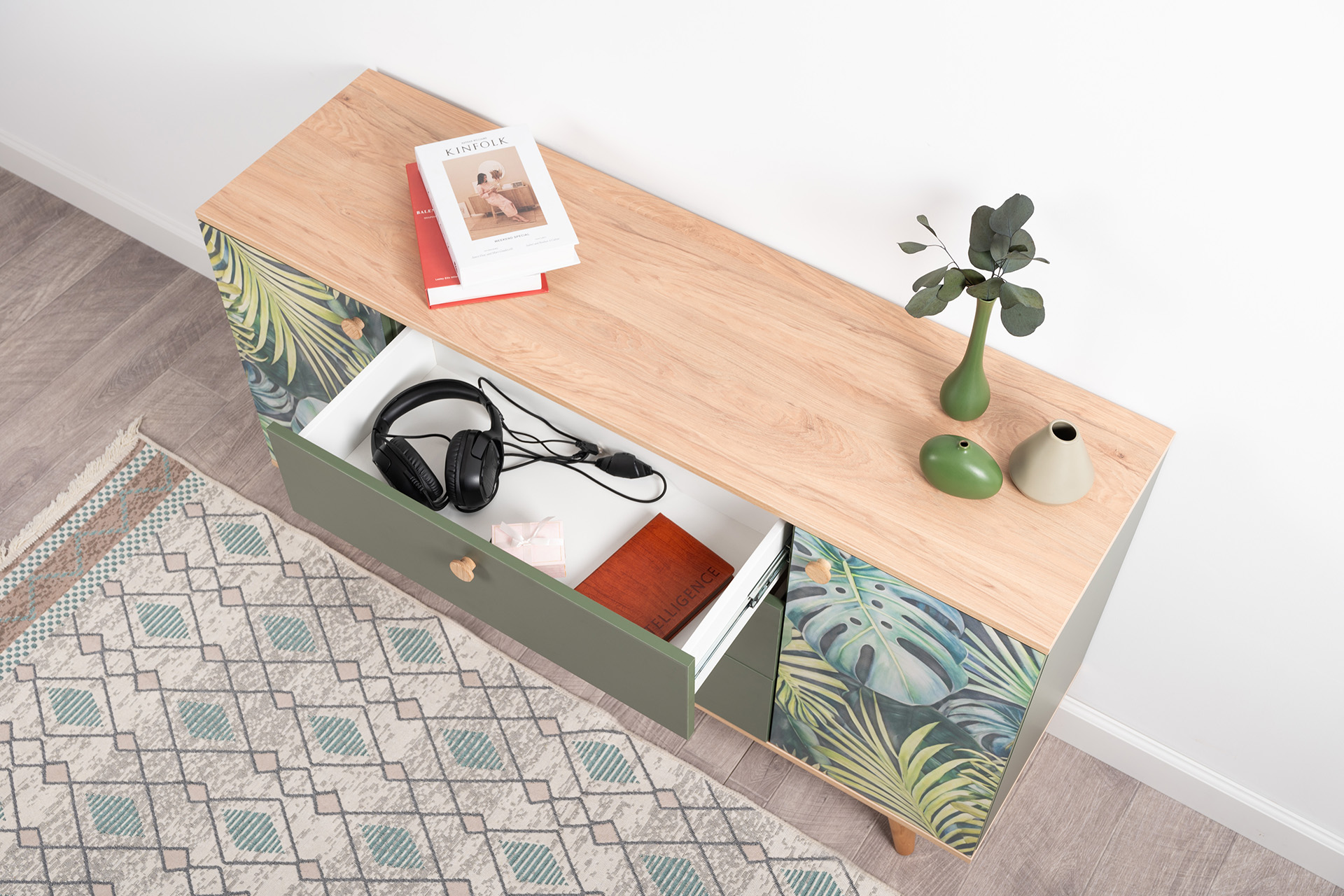 Комод Маттиас 16.245 дымчатый зеленый K521, гикори рокфорд натуральный KO86 PW, белый PE шагрень, фотопечать