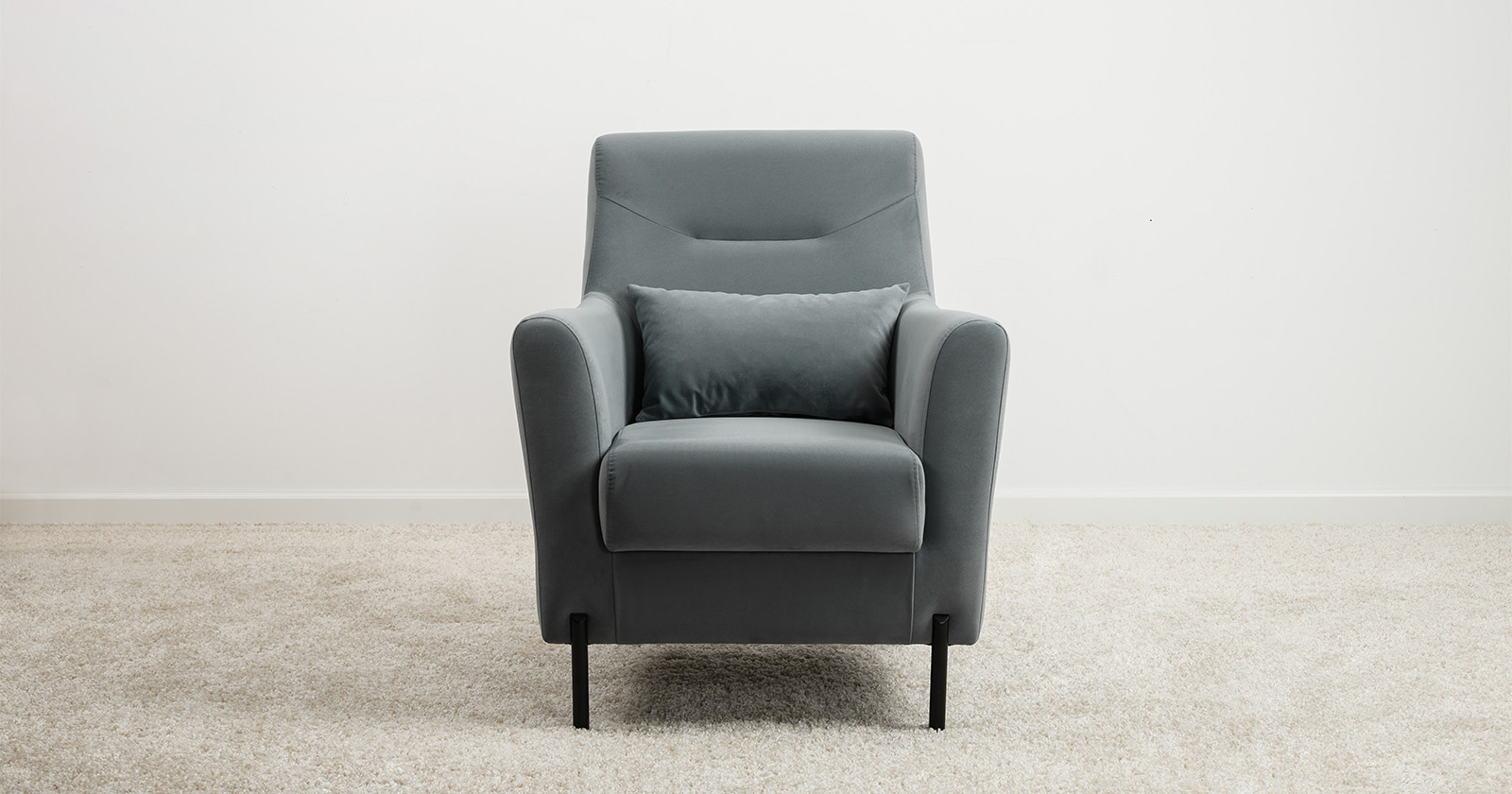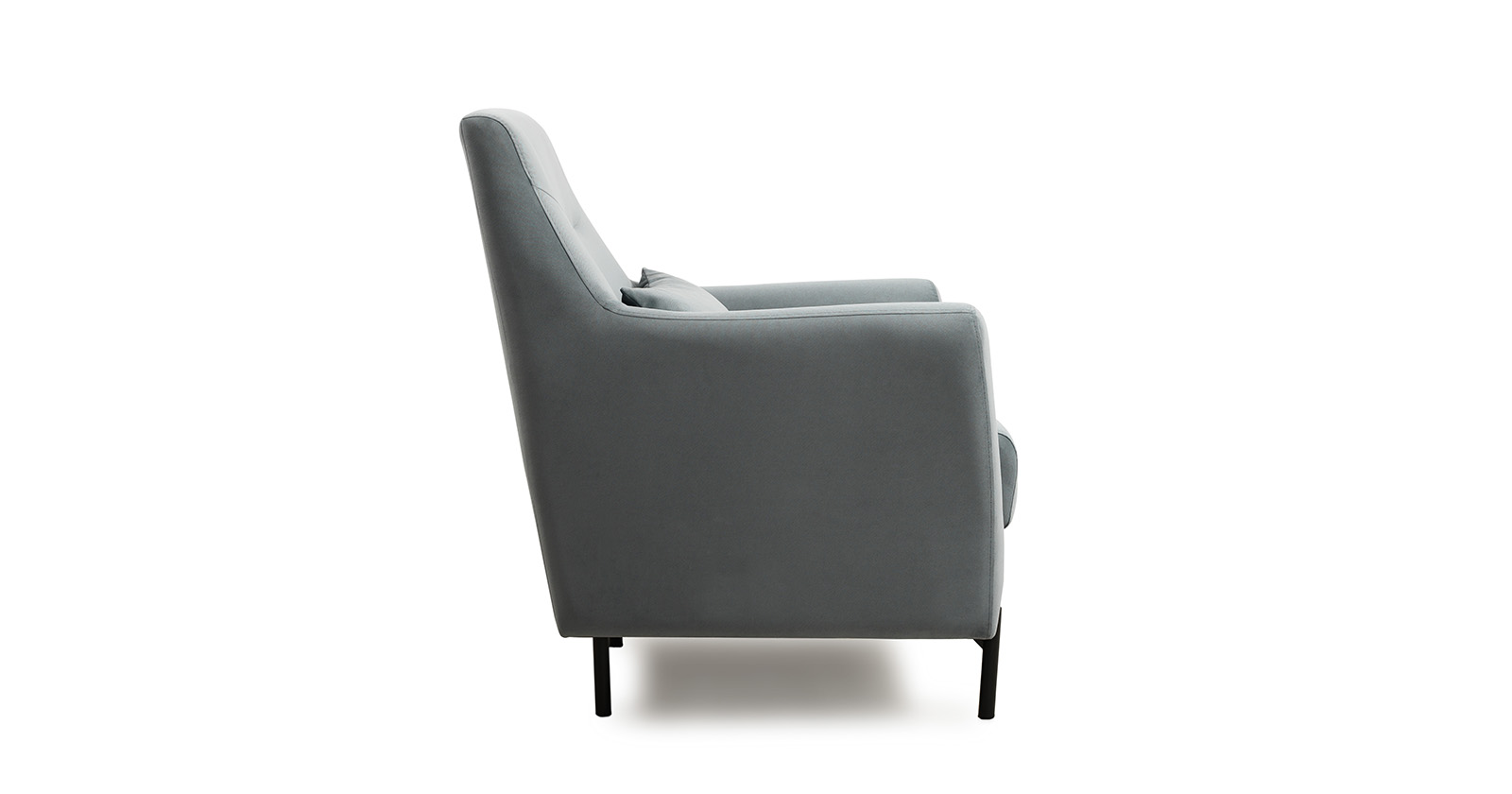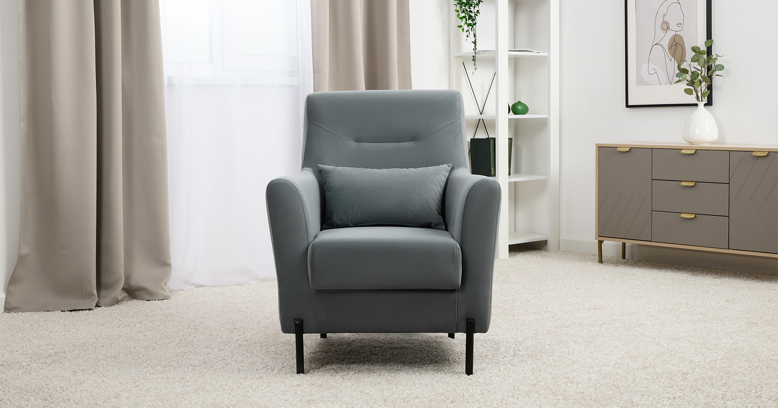 Декоративная утяжка на спинке кресла, декоративная подушка в цвете кресла, металлические опоры переходят в декоративный элемент подлокотника