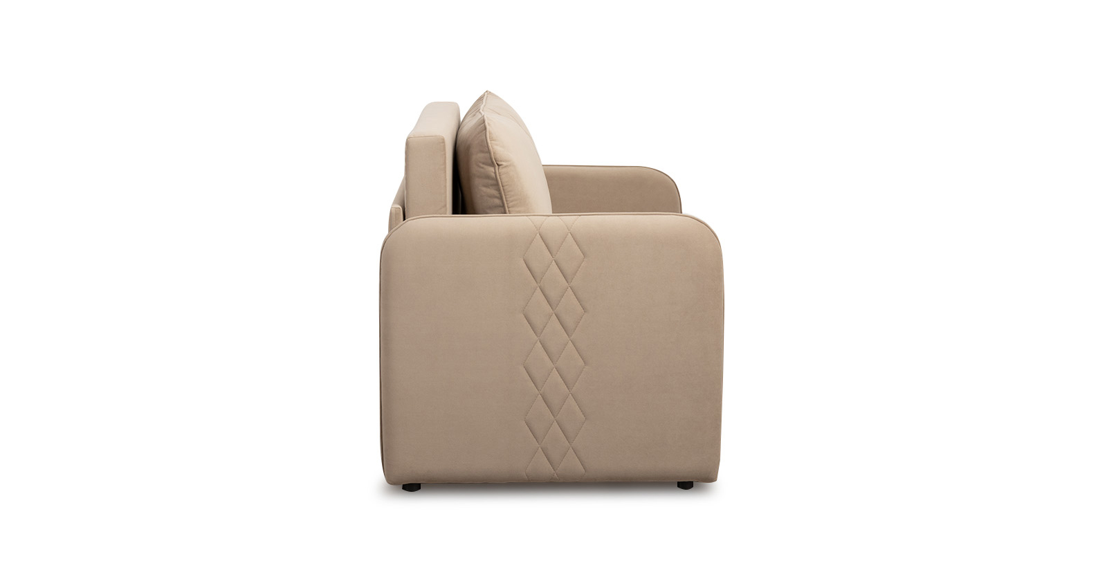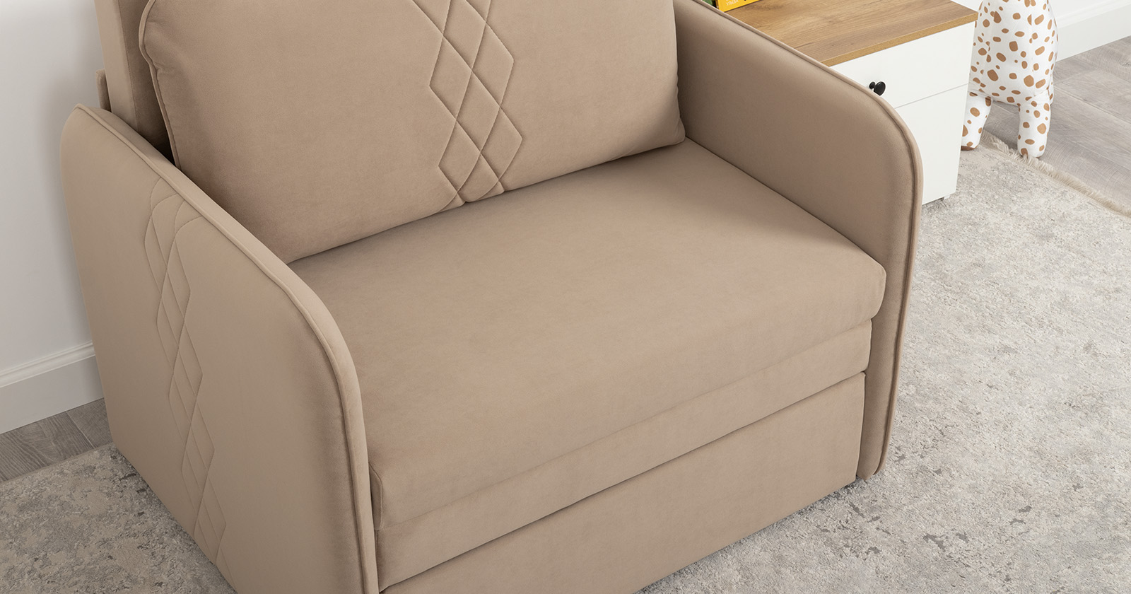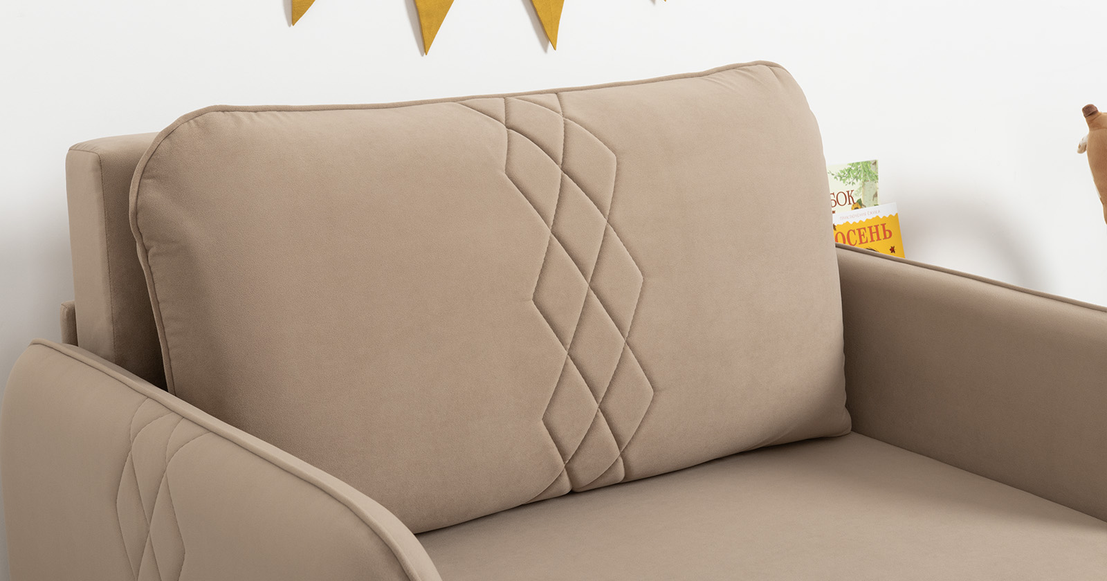 Стильный компактный диван для детской и гостиной. При своих скромных размерах он трансформируется в полноценное спальное место для детей и подростков. Лаконичный дизайн в виде декоративной стежки подчеркивает фактуру велюра, а небольшие размеры позволят разместить его в любом пространстве.