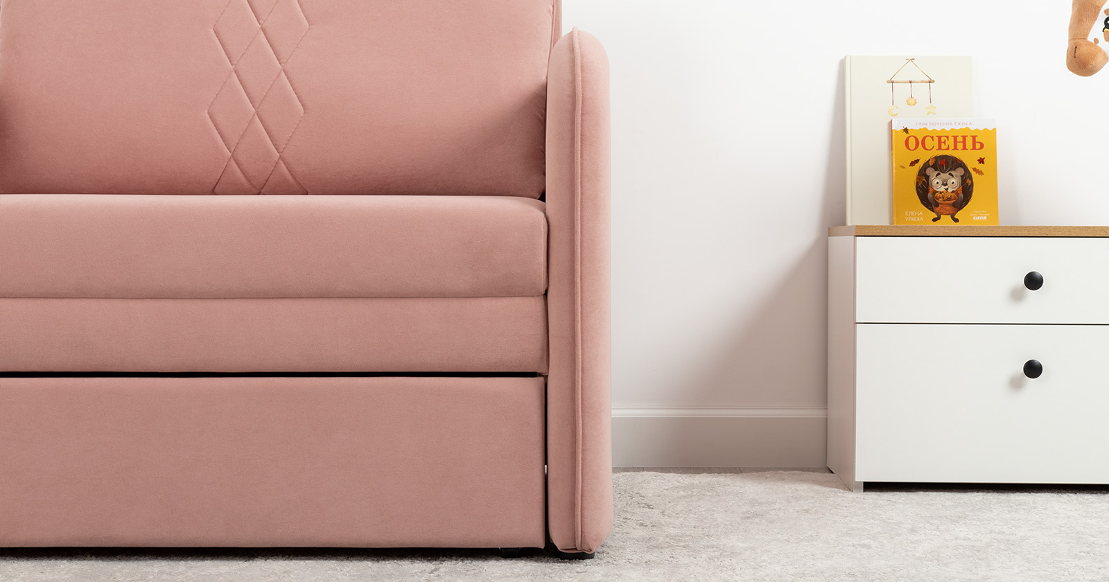 Стильный компактный диван для детской и гостиной. При своих скромных размерах он трансформируется в полноценное спальное место для детей и подростков. Лаконичный дизайн в виде декоративной стежки подчеркивает фактуру велюра, а небольшие размеры позволят разместить его в любом пространстве.
