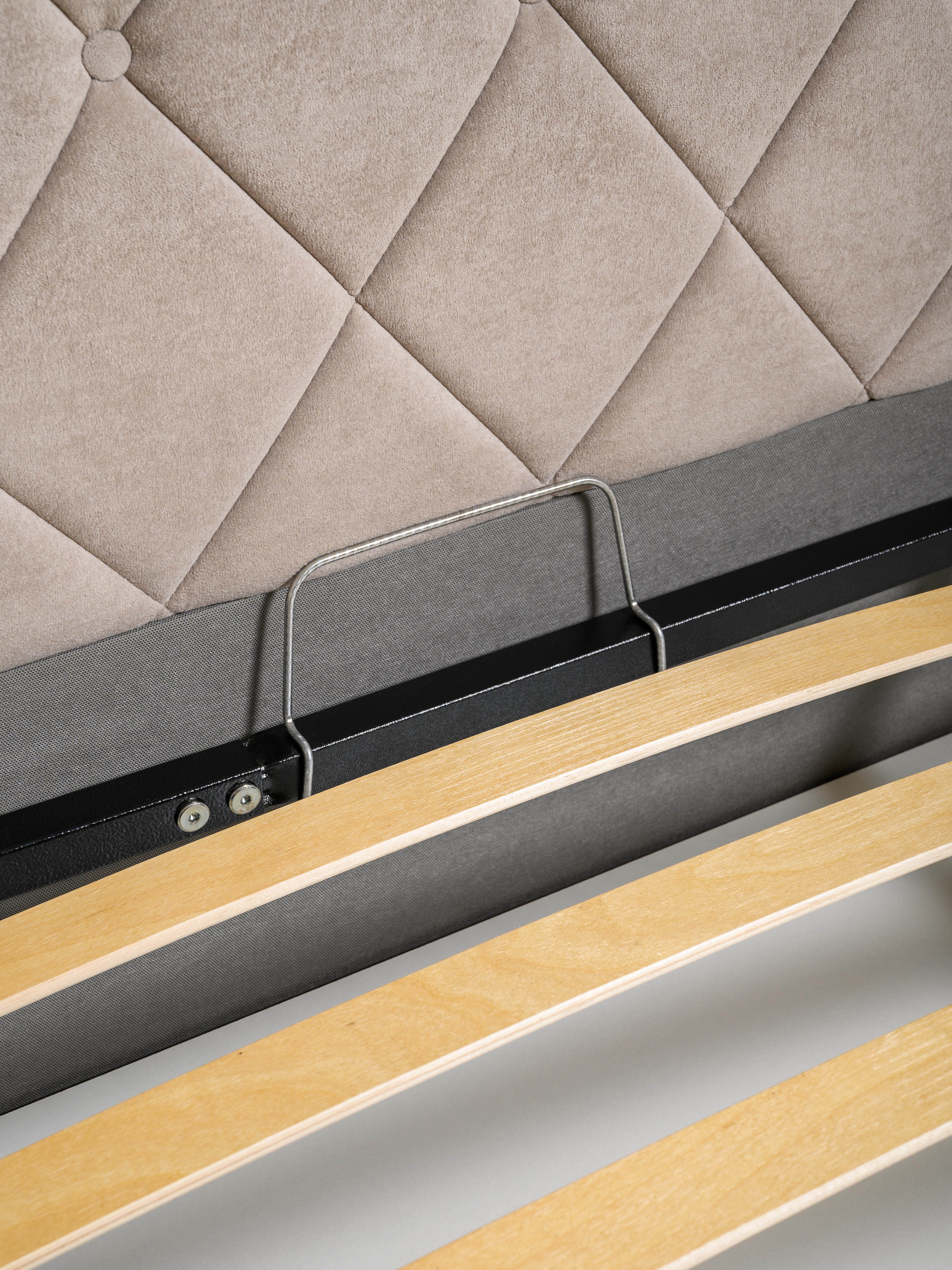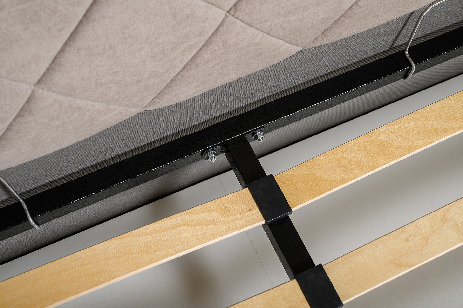 Основание кровати укомплектовано матрасодержателями. Жесткое кроватное дно из ЛДСП 16 мм на опорах 25 мм.