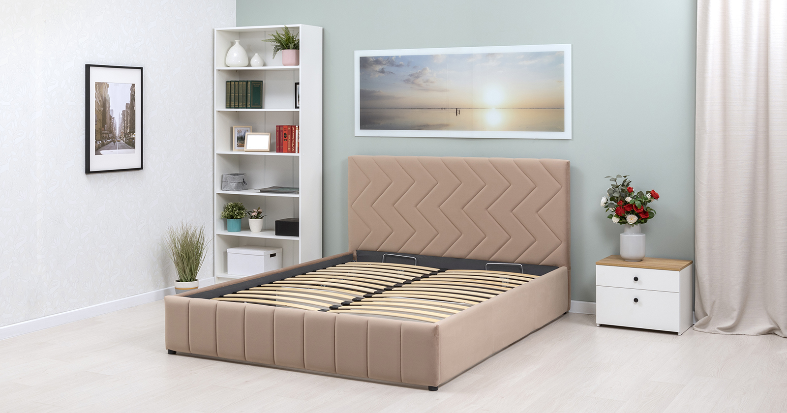 Кровать Милана 160 велюр бежевый кофейный с ортопедическим основанием и подъемным механизмом