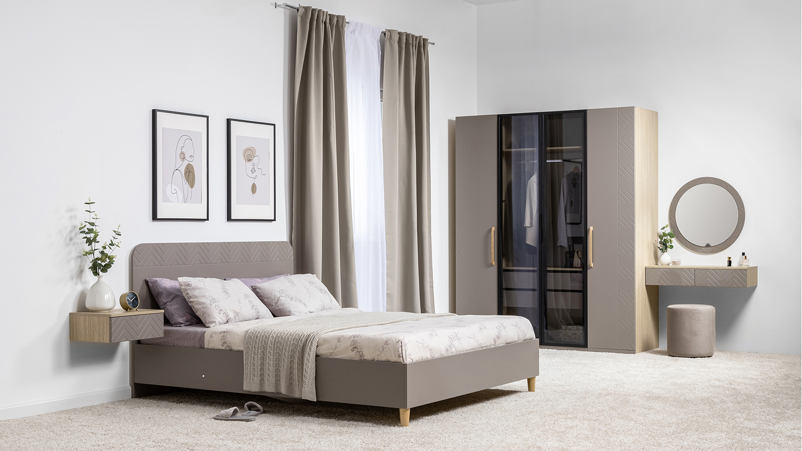 Подвесные консоли и велюровый пуф в тон фасадов дополняют сдержанный и благородный облик спальни Амьен.