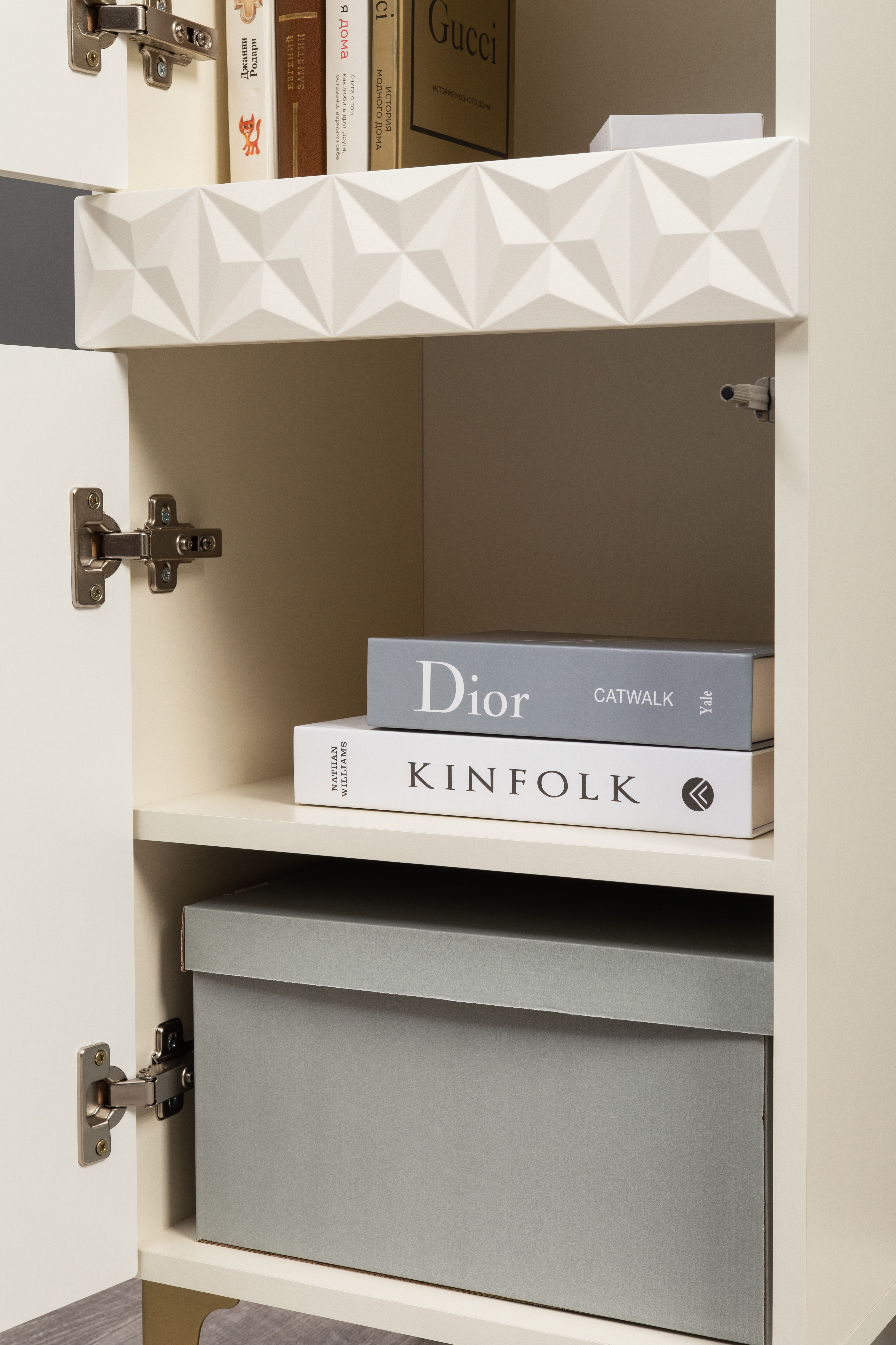 Изящные линии, глубокая фрезеровка фасадов из МДФ и благородные оттенки. Утончённая «Слоновая кость» и изысканная «Олива Шагрень» с глубоким зелёным тоном — создают атмосферу уюта, тепла и благородства. Металлические ручки и опоры золотого цвета придают мебели утончённый блеск, а петли и направляющие с доводчиками обеспечивают плавное и бесшумное закрытие фасадов.