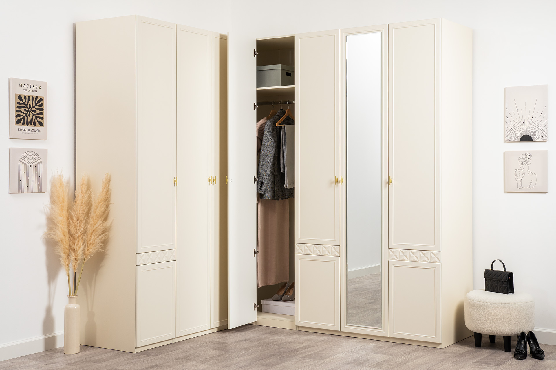 Изящные линии, глубокая фрезеровка фасадов из МДФ и благородные оттенки. Утончённая «Слоновая кость» и изысканная «Олива Шагрень» с глубоким зелёным тоном — создают атмосферу уюта, тепла и благородства. Металлические ручки и опоры золотого цвета придают мебели утончённый блеск, а петли и направляющие с доводчиками обеспечивают плавное и бесшумное закрытие фасадов.