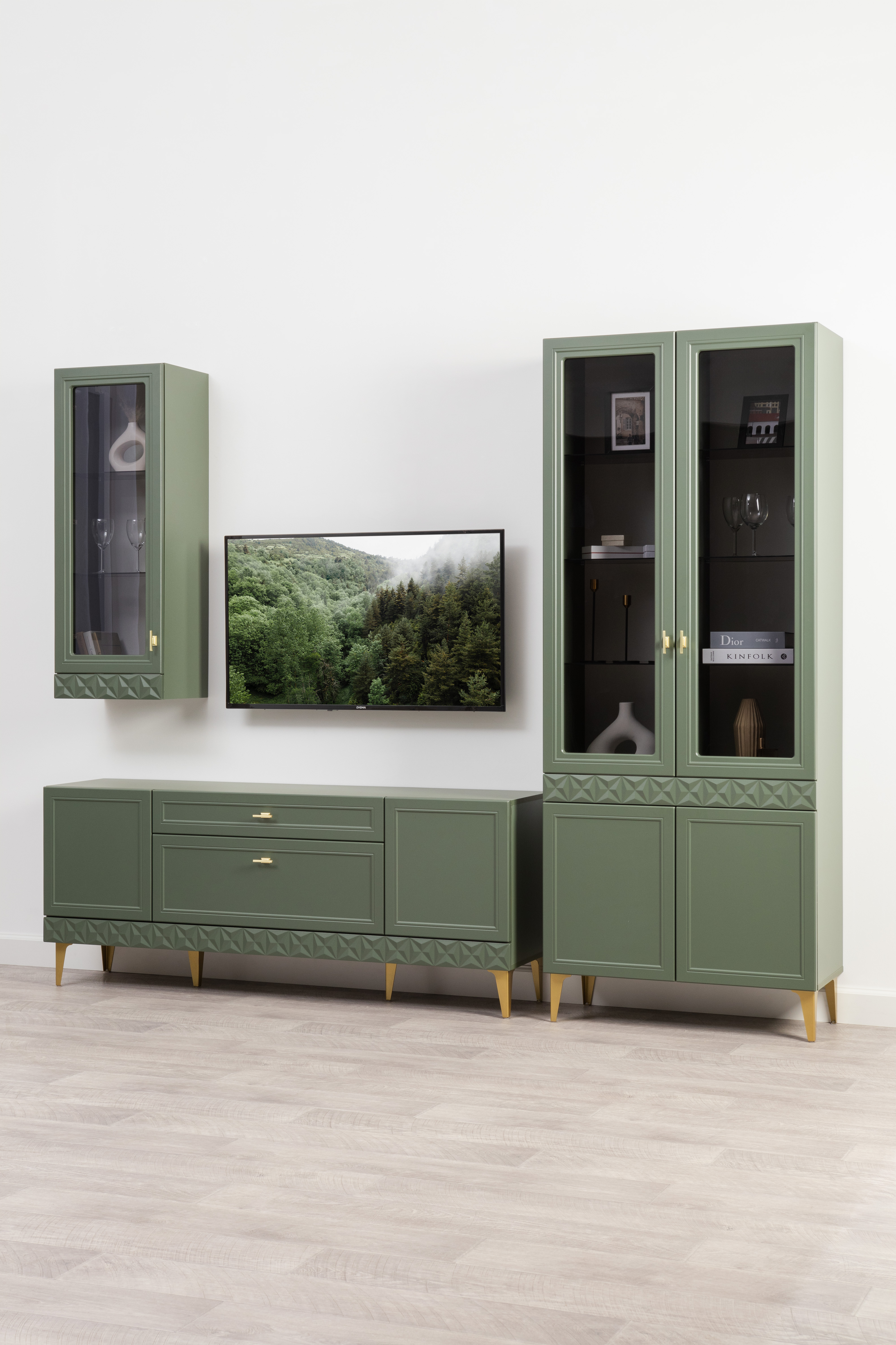 Изящные линии, глубокая фрезеровка фасадов из МДФ и благородные оттенки. Утончённая «Слоновая кость» и изысканная «Олива Шагрень» с глубоким зелёным тоном — создают атмосферу уюта, тепла и благородства. Металлические ручки и опоры золотого цвета придают мебели утончённый блеск, а петли и направляющие с доводчиками обеспечивают плавное и бесшумное закрытие фасадов.