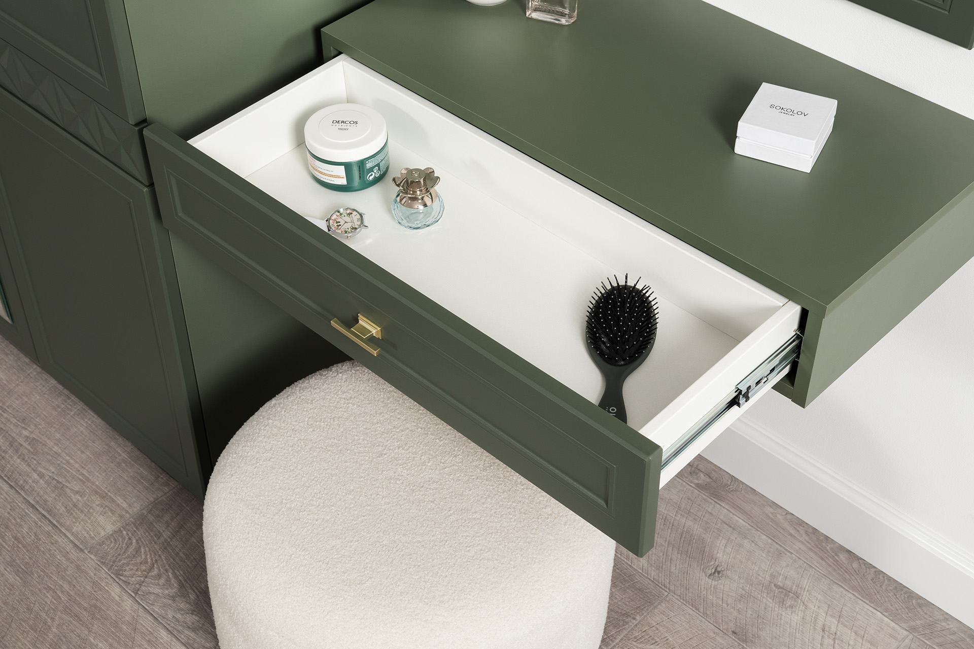 Комод Марион 16.256 дымчатый зеленый K521, олива шагрень AG 1050 ПВХ, белый PE шагрень