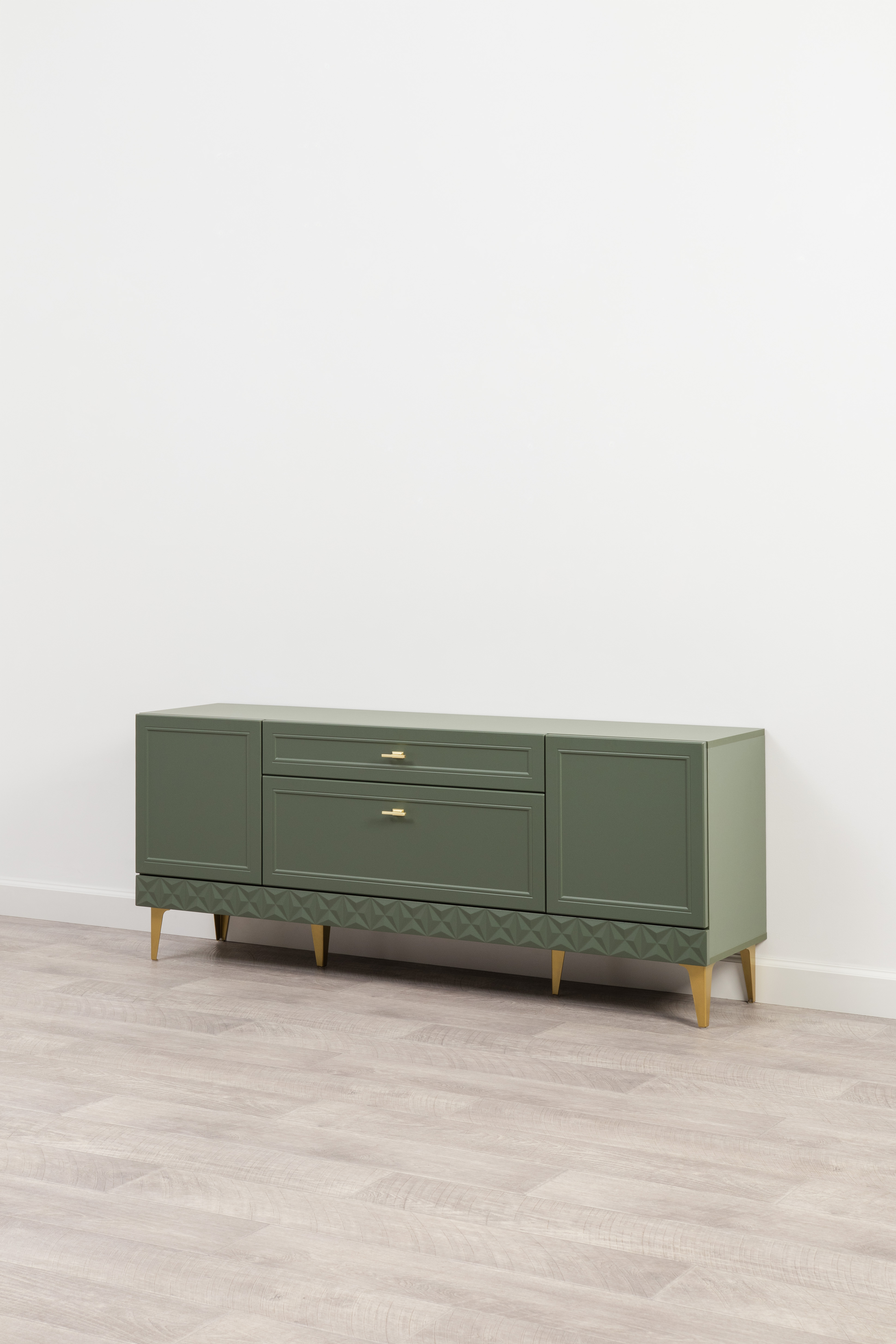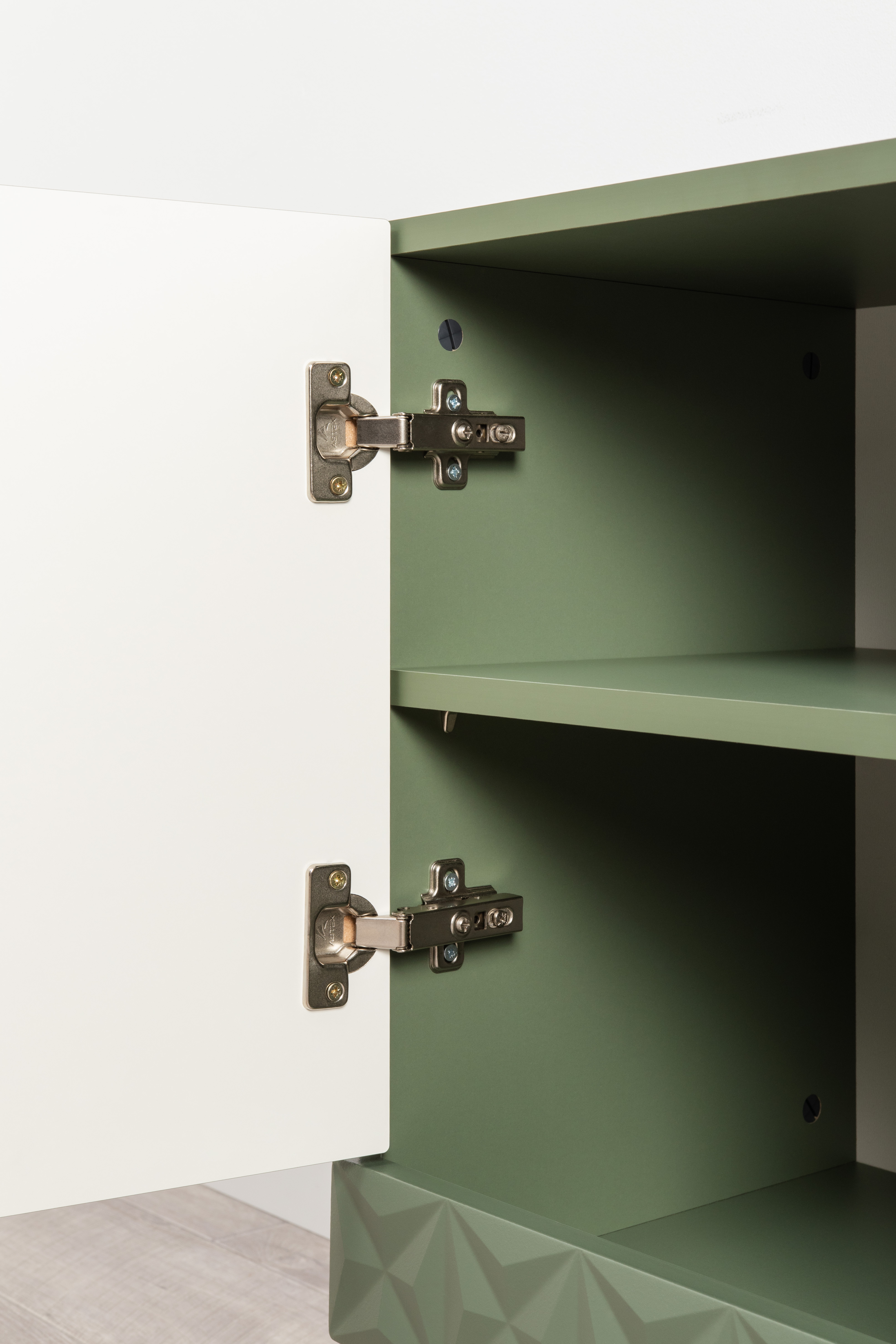 Изящные линии, глубокая фрезеровка фасадов из МДФ и благородные оттенки. Утончённая «Слоновая кость» и изысканная «Олива Шагрень» с глубоким зелёным тоном — создают атмосферу уюта, тепла и благородства. Металлические ручки и опоры золотого цвета придают мебели утончённый блеск, а петли и направляющие с доводчиками обеспечивают плавное и бесшумное закрытие фасадов.