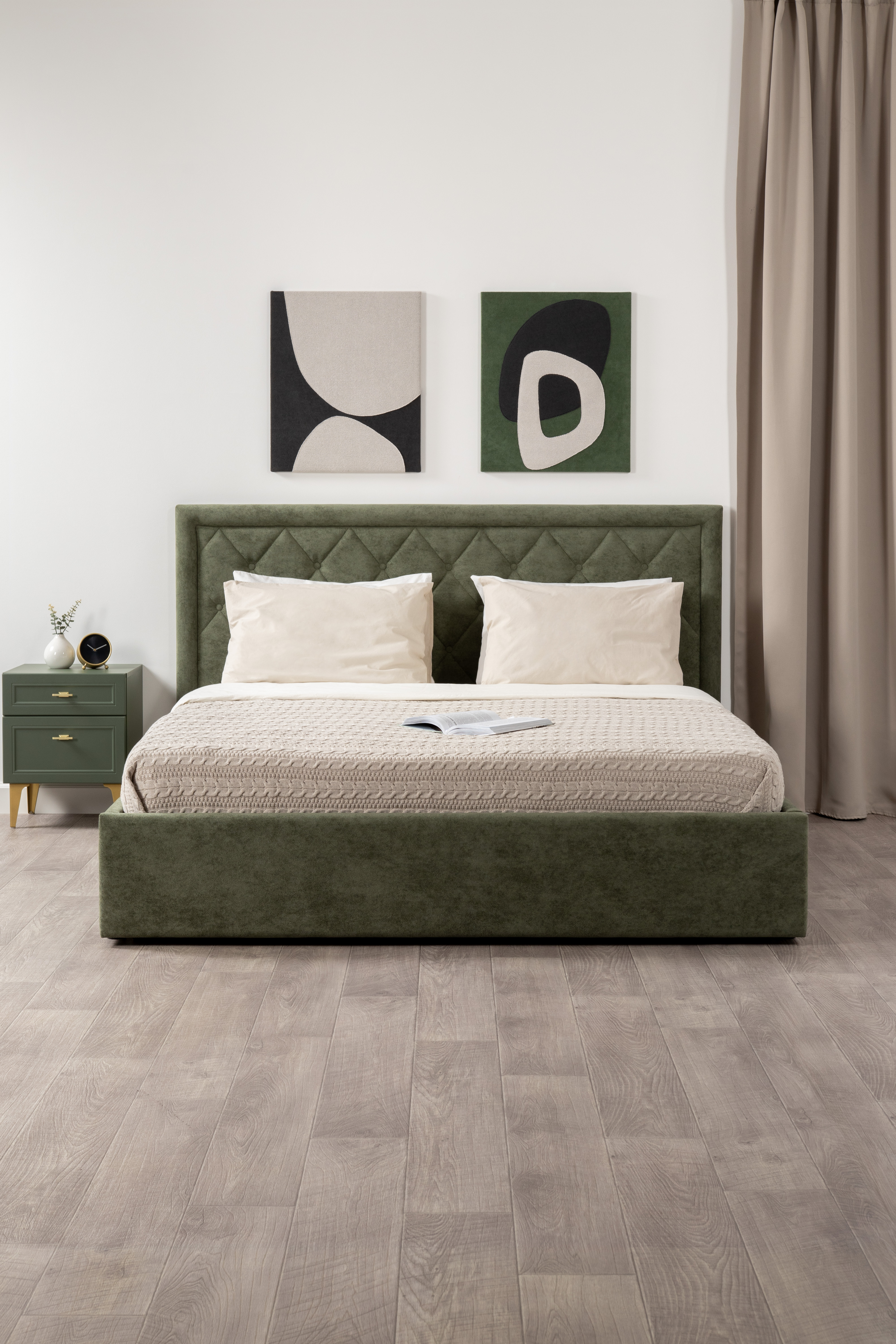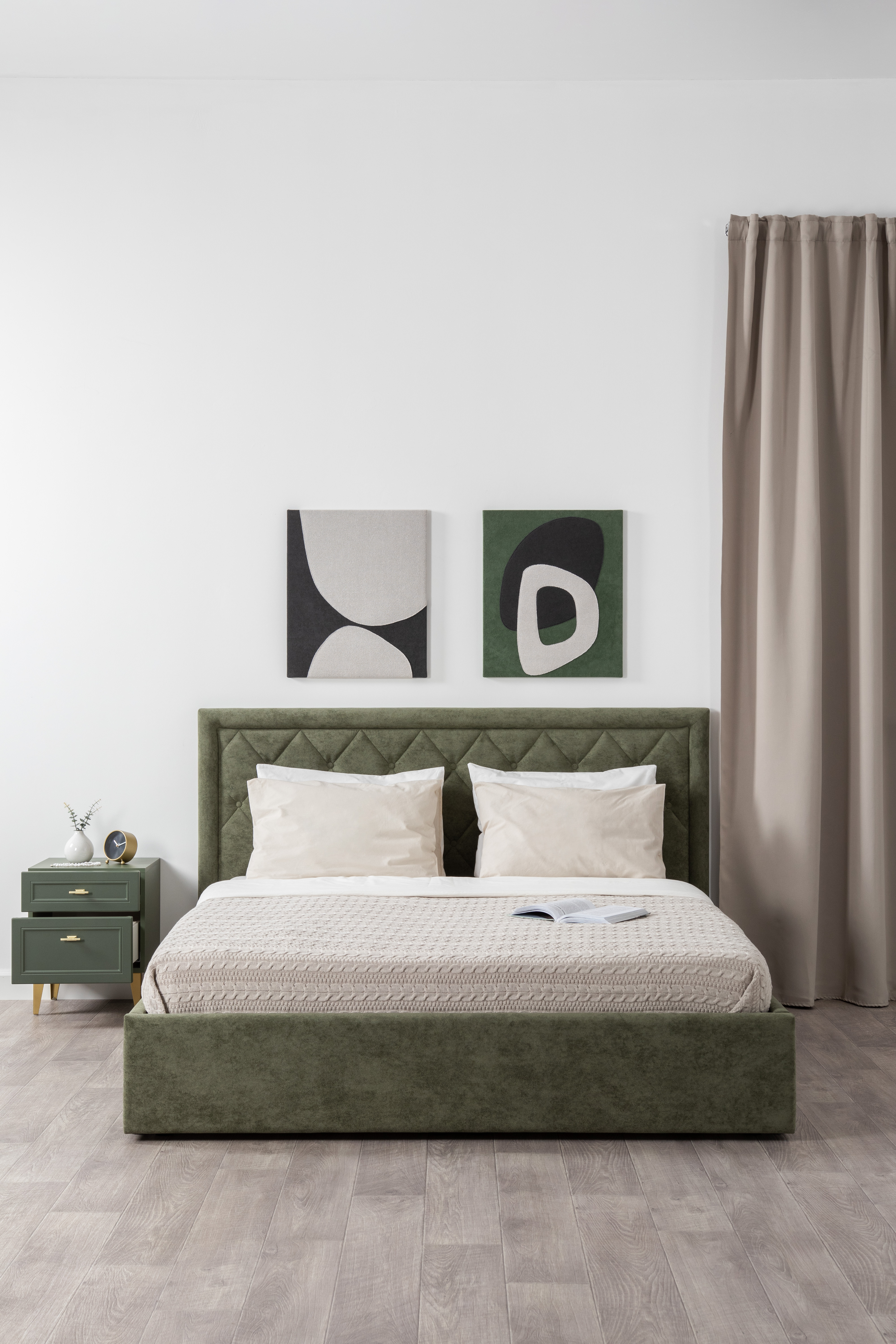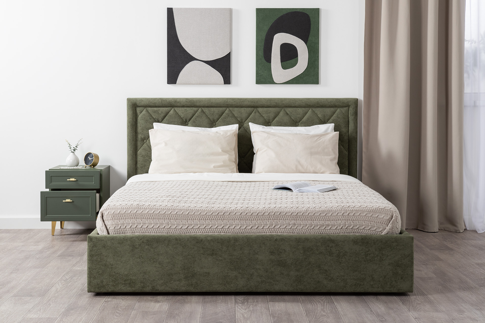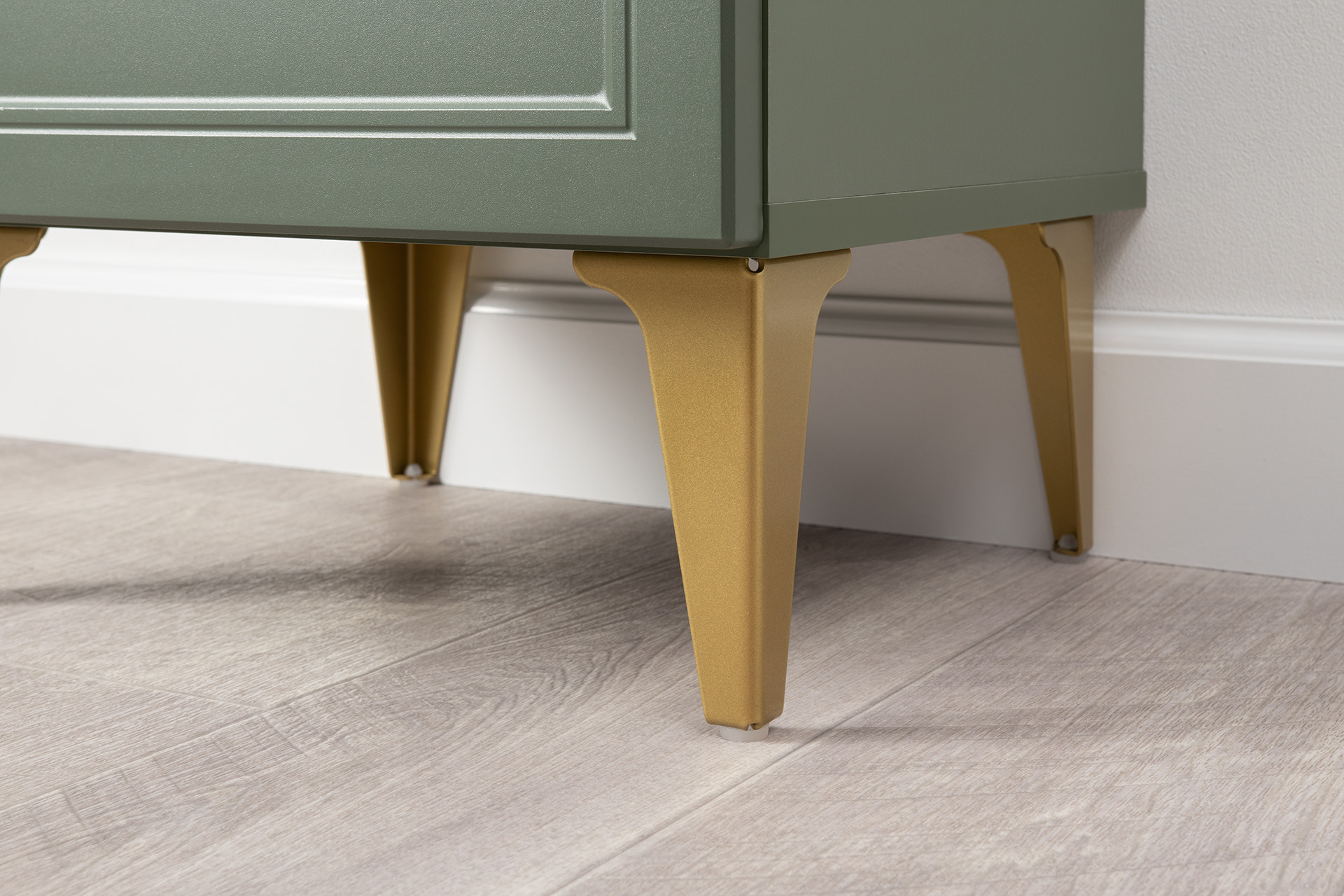 Изящные линии, глубокая фрезеровка фасадов из МДФ и благородные оттенки. Утончённая «Слоновая кость» и изысканная «Олива Шагрень» с глубоким зелёным тоном — создают атмосферу уюта, тепла и благородства. Металлические ручки и опоры золотого цвета придают мебели утончённый блеск, а петли и направляющие с доводчиками обеспечивают плавное и бесшумное закрытие фасадов.