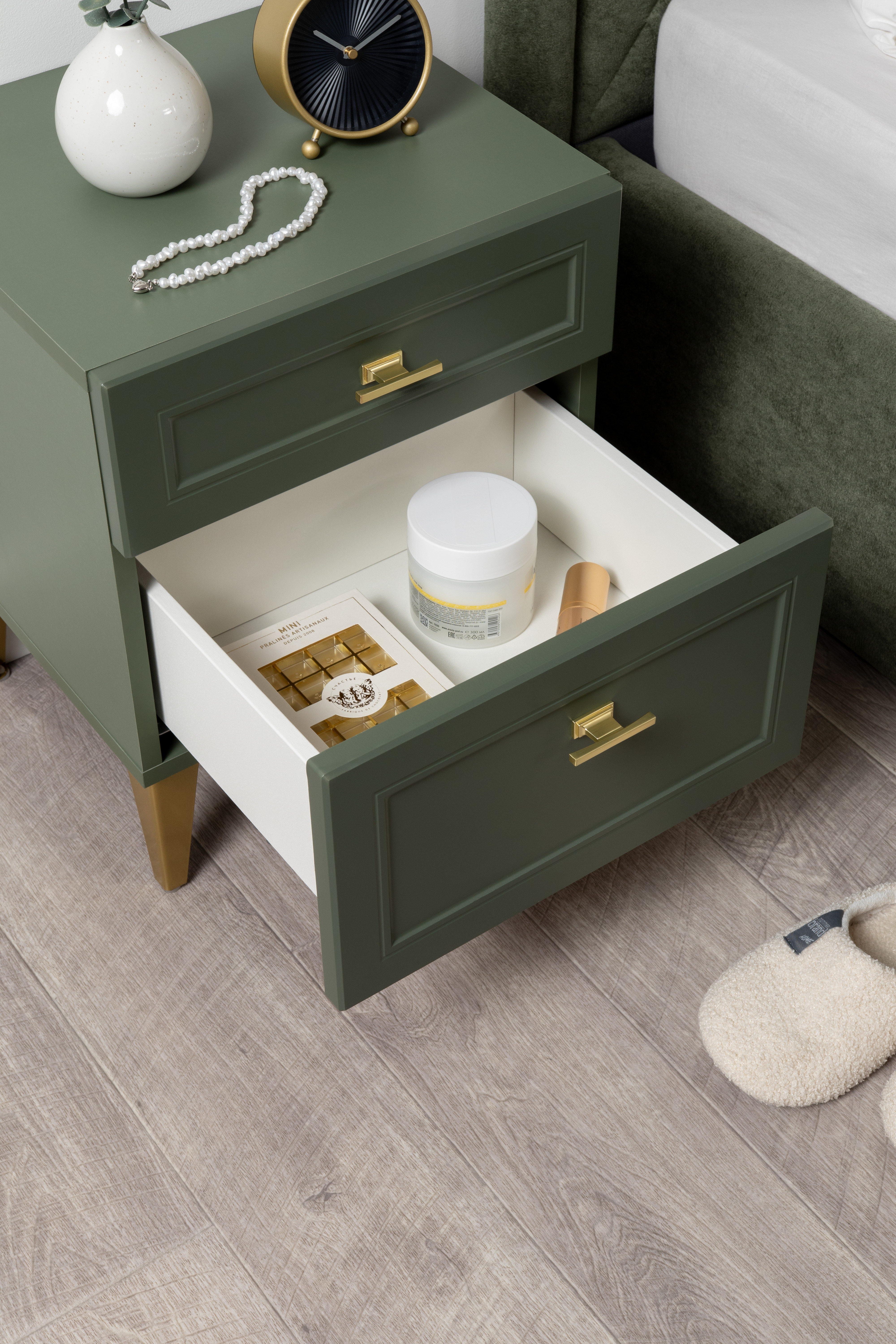 Тумба прикроватная Марион 16.14 дымчатый зеленый K521, олива шагрень AG 1050 ПВХ, белый PE шагрень