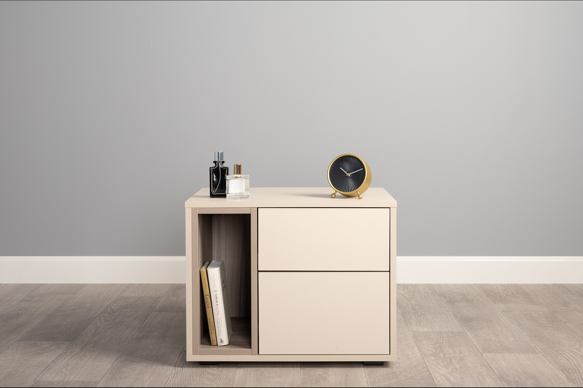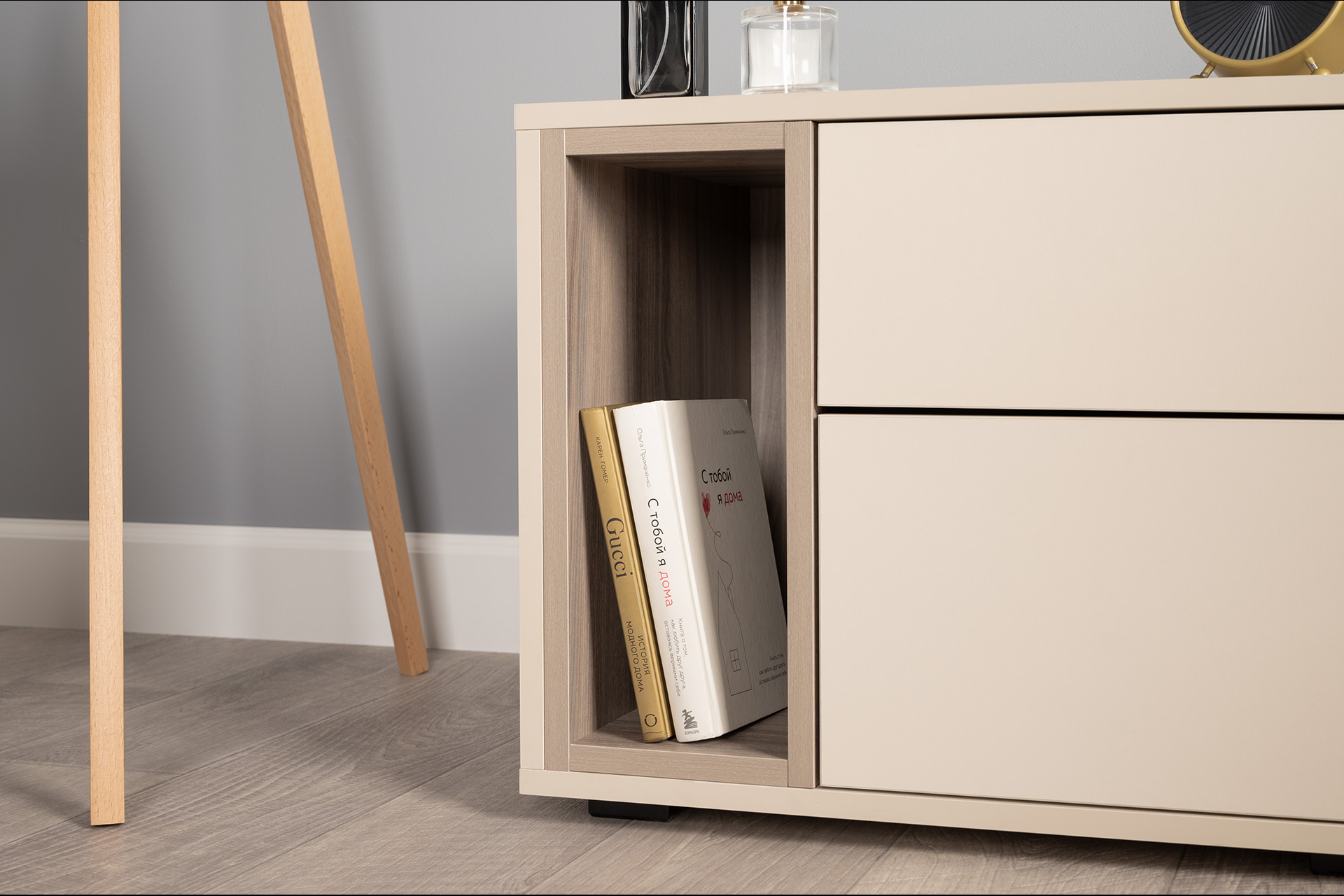 Благодаря нейтральному светлому оттенку и универсальности декора модули можно разместить в спальне, гостиной, прихожей.